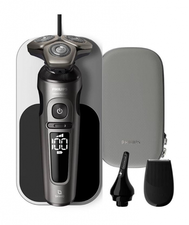 Shaver features Wet shave/Follows face contours/Rinseable blades/Charging base/Travel pouch/Waterproof