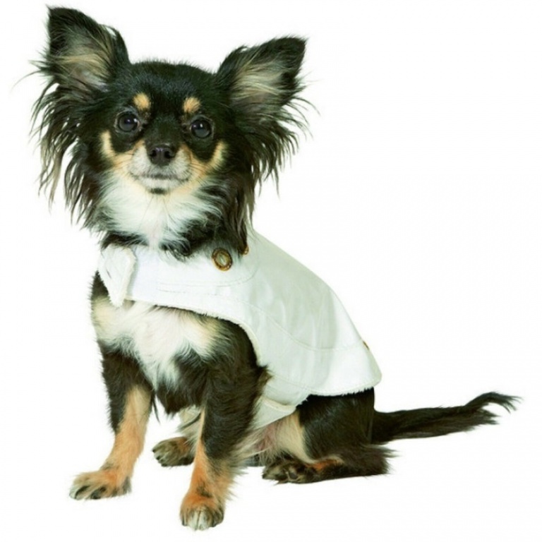 Elegānts mīksts lakādas mētelis, dekorēts ar straziem. Silta plīša odere. Aizdares-līpekļi uz krūtīm un uz vēdera.