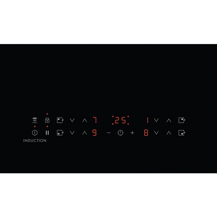 590x520 mm, 4 indukcijas riņķi, bez rāmja, ar noslīpētu priekšmalu, skārienjutīga vadība katrai zonai, Hob2Hood, trauka atpazīšana, taimeris, jaudas pastiprināšanas, pauzes un bērnu drošības funkcijas, Auto-Off