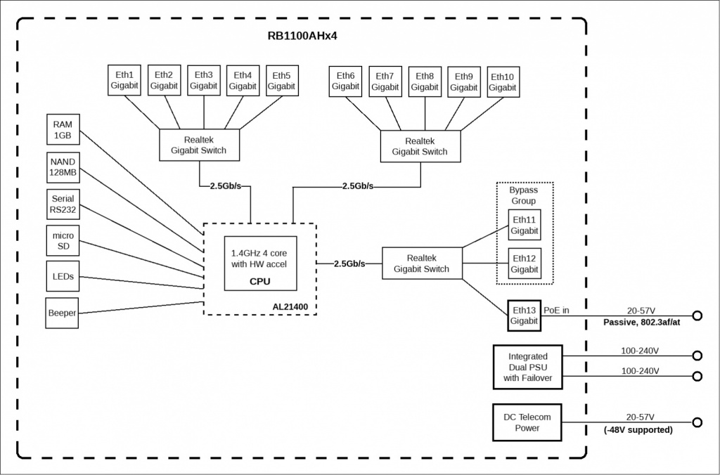 - Citas funkcijas: Introducing RB1100AHx4, 13x Gigabit Ethernet ports Router, powered by Annapurna Alpine AL21400 CPU with four Cortex A15 cores, clocked at 1.4GHz each, for a maximum throughput of up to 7.5Gbit. The device supports IPsec hardware acceleration (up to 2.2Gbps with AES128). Unit comes with 1U rackmount case, RS232 serial port and dual redundant power supplies (with -48v DC telecom power and 802.3at/af support).