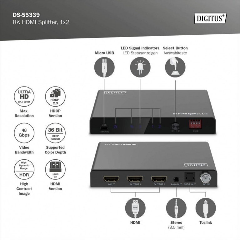 Digitus 8K HDMI Splitter, 1x2 | DS-55339 | Black