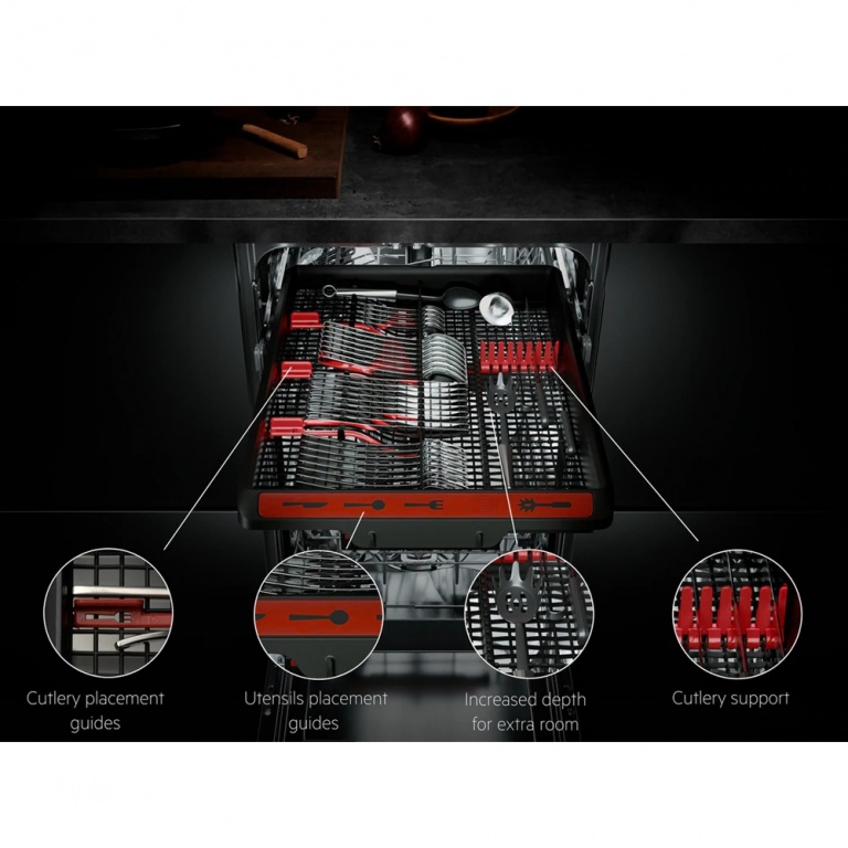 MaxiFlex atvilktnes dizains ļauj tajā ievietot dažādu izmēru galda un virtuves piederumus, pat ja tie ir lieli vai neparastas formas. Piemērojamie sadalītāji un maksimāli izmantotais dziļums ļauj pielāgot ikvienu mazgāšanas reizi. Gandrīz katrs priekšmets tiek netraucēti ievietots un nomazgāts vienā piegājienā.