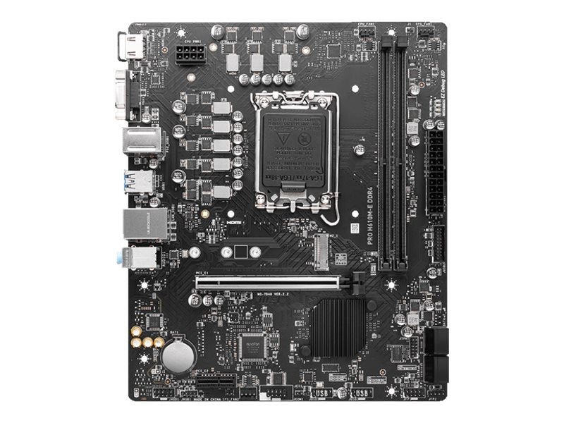 MSI | PRO H610M-E DDR4 | Processor family Intel | Processor socket LGA1700 | DDR4 DIMM | Memory slots 2 | Supported hard disk drive interfaces SATA, M.2 | Number of SATA connectors 4 | Chipset Intel H610 | Mirco-ATX