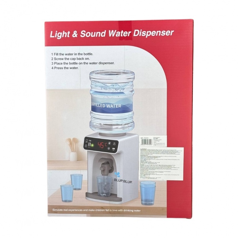 Ierīce izdod raksturīgas skaņas kā īsts ūdens padeves aparāts, tai ir gaismas efekti un slēdzis aktivizēšanai, padarot rotaļu laiku ļoti saistošu.