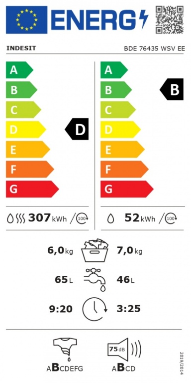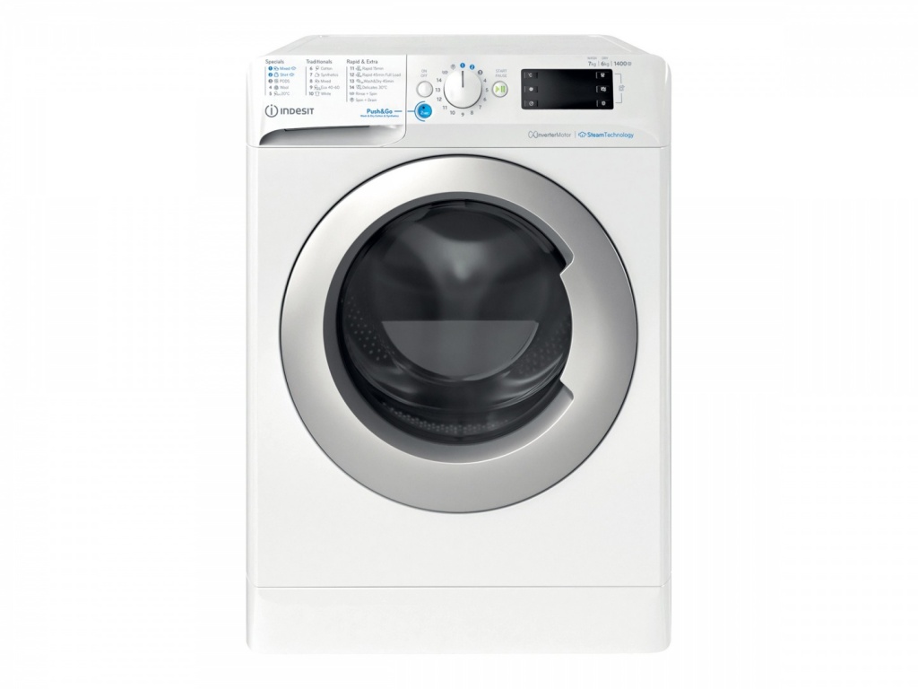 INDESIT | Washing machine with Dryer | BDE 76435 WSV EE | Energy efficiency class B/D | Front loading | Washing capacity 7 kg | 1351 RPM | Depth 54 cm | Width 60 cm | LCD | Drying system | Drying capacity 6 kg | Steam function | White