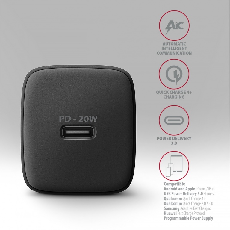 AXAGON Wallcharger 1x port USB-C, PD3.0/PPS/QC4+/AFC/FCP/Apple, 20W | ACU-PD20